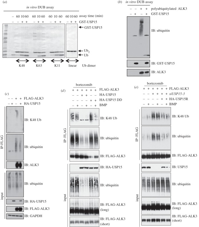 Figure 5. USP15 deubiquitylates ALK3. (a) Human recombinant GST-USP15 expressed in Escherichia coli was employed in an in vitro deubiquitylation assay using K48-, K63- and K11-linked and linear di-ubiquitin (Ub) molecules as substrates. The reactions were quenched by adding SDS sample buffer and boiling for 5 min. The samples were resolved by SDS-PAGE, Coomassie stained and then imaged. (b) HEK293 cell transfected with FLAG control or FLAG-ALK3 vectors were treated with bortezomib (10 μM) for 3 h prior to lysis. FLAG-IPs from extracts (1 mg protein) were used as substrates for GST-USP15 in an in vitro deubiquitylation assay. The reactions were stopped by adding SDS sample buffer and boiling for 5 min. The samples were resolved by SDS-PAGE and subjected to immunoblotting analysis using the indicated antibodies. (c) HEK293 cells were transiently transfected with FLAG control or FLAG-ALK3 vectors with or without HA-USP15. Prior to lysis, cells were treated with 10 μM bortezomib for 3 h. FLAG-IPs and extract inputs were resolved by SDS-PAGE and subjected to immunoblotting analysis using the indicated antibodies. (d) HEK293 cells transiently expressing FLAG-ALK3, HA-USP15 and USP15 C269S DUB dead mutant (DD) were serum-starved overnight, pretreated with 10 μM bortezomib for 3 h then stimulated with 6.25 ng ml–1 BMP for 1 h prior to lysis. FLAG-IPs and extract inputs were resolved by SDS-PAGE and subjected to immunoblotting with the indicated antibodies. (e) HEK293 cells transiently expressing siUSP15-3, FLAG-ALK3 and siUSP15-3 resistant silent mutant of HA-USP15 (HA-USP15R) were serum-starved overnight, pretreated with 10 μM bortezomib for 3 h then stimulated with 6.25 ng ml−1 BMP for 1 h prior to lysis. FLAG-IPs and extract inputs were resolved by SDS-PAGE and subjected to immunoblotting with the indicated antibodies.