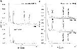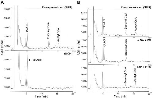 Figure 2. Validation of the identity and purity of CoASH and acetyl CoA peaks detected in Xenopus embryo extracts.(A) 30 stage 8/9 embryos were extracted with 150 µl 5% PCA and the PCA soluble fraction was neutralised with TEA/K2CO3. CoA compounds in neutralised PCA extracts were analysed by HPLC before and after KOH treatment as described in the Materials and Methods section. KOH treatment caused conversion of peaks corresponding to succinyl CoA and acetyl CoA, to free CoASH. Retention times (in minutes): CoASH, 5.15; succinyl CoA, 12.13; acetyl CoA, 15.17. (B) 30 stage 8/9 embryos were extracted with 150 µl 5% PCA and the PCA soluble fraction was neutralised with TEA/K2CO3. The neutralised extract was analysed by HPLC without further treatment (top panel), or after incubation for 10 min at 30°C with 0.11 mM oxaloacetate (OA) and citrate synthase (CS) (middel panel), or with 60 mM KCl, 9.4 mM acetyl phosphate (AP), and phosphotransacetylase (PTA) (bottom panel). Incubation of Xenopus extract with citrate synthase, in the presence of oxaloacetate, caused complete disappearance of the peak corresponding to acetyl CoA and an increase in the size of the peak corresponding to CoASH (peak areas before treatment: CoASH, 9337.25; succinyl CoA, 11626; acetyl CoA, 6678. Peak areas after treatment: CoASH, 18217.5; succinyl CoA, 11252.25; acetyl CoA, no peak detected). Conversely, incubation with phosphotransacetylase, in the presence of acetyl phosphate, completely removed the peak corresponding to CoASH and increased the size of the acetyl CoA peak (peak areas after treatment: CoASH, not detected; succinyl CoA, 9278.5; acetyl CoA, 15213.5). These results confirm unequivocally the identity of the CoASH and acetyl CoA peaks and that there are no other compounds co-eluting with these peaks that absorb at 254 nm. Retention times in minutes: top panel; CoASH, 5.17; succinyl CoA, 12.26; acetyl CoA, 15.51; middle panel; CoASH, 5.24; succinyl CoA, 12.43; acetyl CoA, not detected; bottom panel; CoASH, not detected; succinyl CoA, 12.12; acetyl CoA, 15.36. |