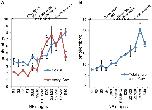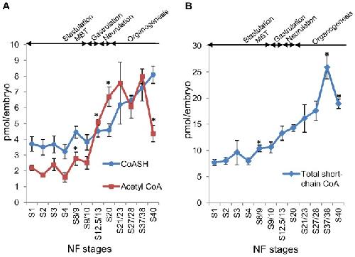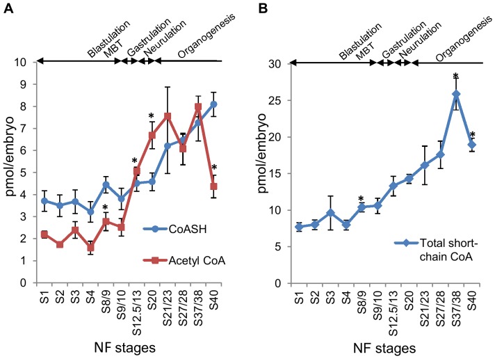 Figure 3. Levels of CoASH, acetyl CoA and total short-chain CoA esters during the early embryonic development of Xenopus laevis. (A) Levels of unesterified CoA (CoASH) and acetyl CoA were measured in neutralised PCA extracts of Xenopus embryos collected at different stages of early embryonic development. Embryonic stages were determined as described by Nieuwkoop and Faber [24]. 30 embryos were collected for the determination of CoA compounds at each stage. The number of independent measurements (in brackets) performed for each stage is as follows: S1 (8); S2 (5); S3 (5); S4 (9); S8/9 (6); S9/10 (9); S12.5/13 (4); S20 (6); S21/23 (3); S27/28 (3); S37/38 (4); S40 (3). Each data point represents the mean +/− SEM. * indicates statistical significance (p<0.05) compared to the immediately preceding stage as determined by Student's t test. (B) Levels of total acid-soluble CoA species, representing combined levels of CoASH and total short-chain CoA esters, were determined after KOH hydrolysis as described in the Materials and Methods section. The number of independent measurements performed for each stage is as follows: S1 (7); S2 (4); S3 (3); S4 (9); S8/9 (6); S9/10 (8); S12.5/13 (4); S20 (6); S21/23 (3); S27/28 (3); S37/38 (4); S40 (3). Each data point represents the mean +/− SEM. * indicates statistical significance (p<0.05) compared to the immediately preceding stage as determined by Student's t test. |