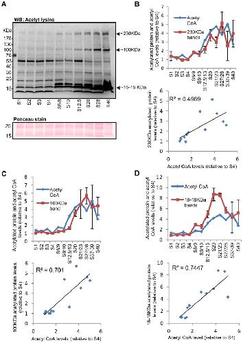 Figure 4. Whole-embryo acetylation levels of a number of proteins in Xenopus embryos appear to correlate with the pattern of change in acetyl CoA levels.(A) 20 embryos collected at different stages of development were lysed in 80 µl lysis buffer and approximately 40 µg of soluble protein was separated by SDS-PAGE, transferred to a PVDF membrane and probed with anti-acetyl lysine antibody. Equal protein loading was checked by Ponceau staining of the membrane and a Coomassie stain of a gel run in parallel. A section of the Ponceau stained membrane is shown (the complete Ponceau stained membrane and the Coomassie stained gel are shown in Figure S3). Changes in the abundance of a number of acetylated proteins, including those with molecular weights of approximately 230 KDa, 100 KDa, 16 KDa, and 18 KDa (indicated by arrows), appear to follow the overall pattern of change in acetyl CoA levels. (B–D, top graphs) Embryos at different stages of development were collected and Western blotting, with anti-acetyl lysine antibody, was performed as above. The intensity/size of acetylated protein bands at approximately 230 KDa (B), 100 KDa (C) and 16–18 KDa (D) were quantified, normalised to stage 4, and plotted against different stages of development together with levels of acetyl CoA (taken from Figure 3 and expressed relative to stage 4). Band intensity/size was normalised against stage 4 as this stage is included in all the blots performed. Each data point represents a single measurement or the mean +/− SEM of 2–7 measurements. The number of independent measurements (using samples from independent fertilisations) performed for each stage was as follows: S1 (4); S2 (4); S3 (1); S4 (7); S8/9 (1); S9/10 (7); S12.5/13 (4); S20 (5); S21 (2); S27/28 (4); S39/39 (2); S40 (3). (B–D, bottom graphs) The means of normalised band intensity/size for acetylated proteins at approximately 230 KDa (B), 100 KDa (C) and 16–18 KDa (D) were plotted against acetyl CoA levels (taken from Figure 3 and also normalised to stage 4) and R2 values are shown. |