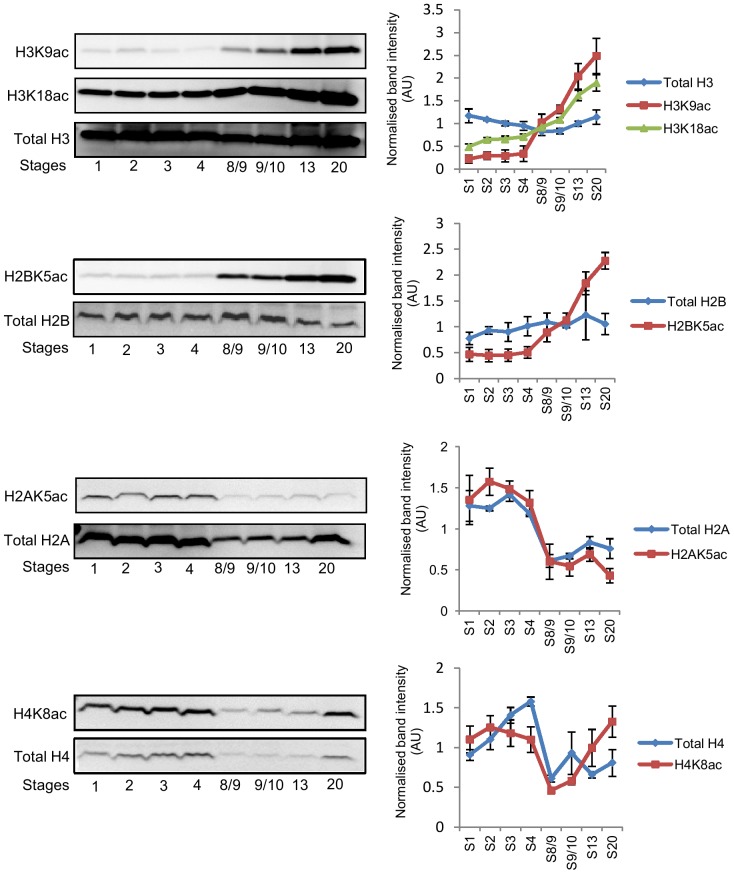 Figure 5. Whole-embryo acetylation levels of core histones during early Xenopus embryonic development.20 embryos collected at different stages of development were lysed in 80 µl lysis buffer and approximately 40 µg of soluble protein was separated by SDS-PAGE, transferred to PVDF membranes and probed with either site-specific anti-acetyl histone antibodies or total anti-histone antibodies. Total and acetylated histones were determined on separate membranes. Representative blots are shown. The graphs show means +/− SEM of normalised band intensity/size obtained from 3 independent fertilisations. The band intensity/size of total and acetylated histones at each stage is expressed relative to the mean of all the stages analysed. |