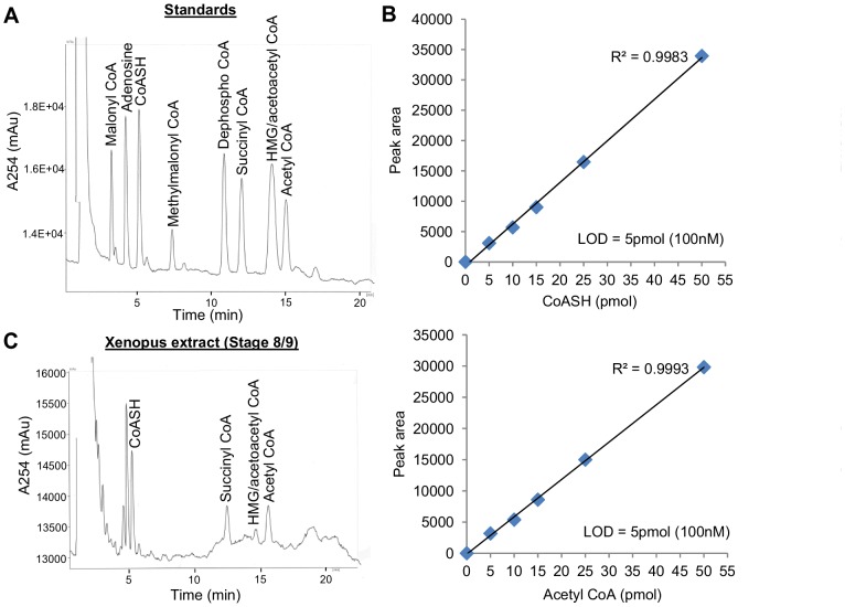 Figure 1. Chromatographic separation of CoA standards and a PCA extract of Xenopus embryos.(A) HPLC chromatogram illustrating separation of CoA compounds. Standards of CoASH, CoA thioesters and adenosine (20–50 pmol each) were separated on a C18 column (Kinetex C18 100 X 4.60 mm column with 2.6 µm particle size and 100 Å pore size) using a mobile phase consisting of 150 mM Na2H2PO4 and 9% methanol and a flow rate of 0.8 ml/min (see Materials and Methods for details). Standards were made up in mobile phase, which additionally contained 5 mM EDTA and 10 mM TCEP before injection. CoA compounds were detected by absorbance at 254 nm. Retention times (in minutes): malonyl CoA, 3.21; adenosine, 4.16; CoASH, 5.06; methylmalonyl CoA, 7.26; dephospho CoA, 10.7; succinyl CoA, 11.87; HMG/acetoacetyl CoA, 13.96; acetyl CoA, 14.83. See Table S1 for day-to-day variability in retention times. (B) Graphs showing linearity between the peak area and the amount of CoASH and acetyl CoA injected. Different amounts of CoASH and acetyl CoA standards were injected and the peak areas were determined by Borwin chromatography software. Each data point represents the mean of duplicate measurements. The limit of detection (LOD) for each compound was determined to be 5 pmol (100 nM). (C) Representative chromatogram showing separation of a PCA extract of stage 8/9 Xenopus embryos. CoA peaks were identified by comparison of retention times with those of authentic standards determined on the same day. Peaks corresponding to CoASH, succinyl CoA, HMG/acetoacetyl CoA and acetyl CoA were detected. Retention times (in minutes): CoASH, 5.21; succinyl CoA, 12.32; HMG/acetoacetyl CoA, 14.44; acetyl CoA, 15.43. |