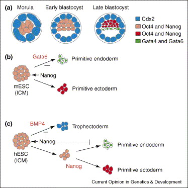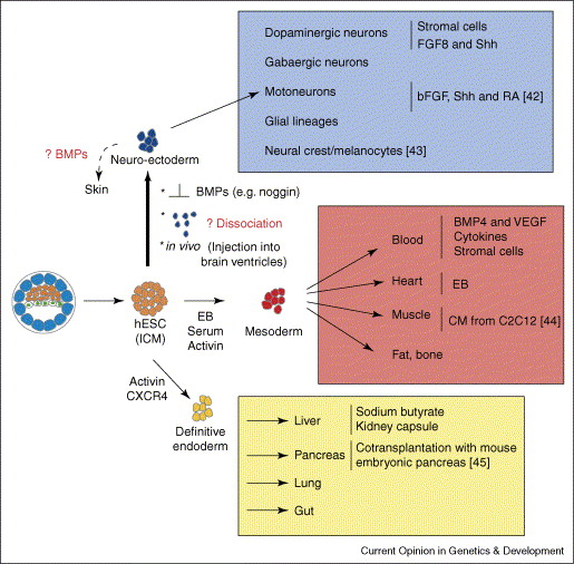 Embryonic stem cells are uniquely endowed with the capacity of self-renewal and the potential to give rise to all possible cell types, including germ cells. These qualities have made mouse embryonic stem cells a valuable resource for genetic manipulation of the mouse genome. In addition, they present a powerful system for the in vitro dissection of mammalian embryonic development. The recent isolation of human embryonic stem cells has raised a lot of interest for the potential of transposing our knowledge of lineage-specific differentiation of embryonic stem cells to cell-based therapy of human disease. Recent reports have provided insights into the specific differentiation of embryonic stem cells to different cell types of the embryo. However, progress in this direction seems to depend on the knowledge of the mechanisms controlling lineage decisions during embryogenesis.