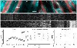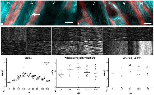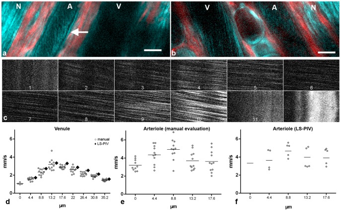 Figure 3. THG microscopy in the mouse ear.(a,b) Intravital imaging in different animals with arteriole (A), venule (V) and nerve fiber (N) running in parallel. In addition to the THG signal (cyan) SHG (red) is displayed. The arrow points to a typical linear vessel wall signal found only in arterioles. Scale bars 20 µm. The declining THG signal strength in more axial parts of a vessel are easiest to recognize in the arteriole in (a) and the venule in (b). (câe) Flow velocity profile measurements by THG shifted line scan in the venule shown in b. (c) Clippings from x-t-representations of 12 parallel scan lines spaced 4.4 µm from each other. Lines 1, 11 and 12 were located in the vessel wall and thus show no movement. Note the shallower angles (faster velocity) and decreased intensity in the central scans. (d) Measurements derived from c by manual evaluation of individual streaks (circles) with mean values (horizontal lines) and mean values from LS-PIV calculations (diamonds). Scan lines 2 (0 µm) to 10 (35.2 µm) from (c) are included. Manually measured velocities revealed significant differences between the scan lines (p<0.0001, ANOVA) with significant differences between all direct neighbors (p<0.05 or smaller, post hoc Newman-Keuls test). For scan line 2 (0 µm), only a part of the x-t-representation showed blood flow. Apparently this line was close to the vessel wall so that slight movement could shift it outside. No reasonable LS-PIV average could thus be obtained. LS-PIV evaluations of the other scan lines confirmed significantly different blood flow velocities in general (p<0.0001; ANOVA, nâ=â88 for each line) and for all direct neighbors (****), except for the two central lines. (e) Measurements by manual evaluation for the arteriole shown in (b) Velocity measurements were significantly different between 0 and 4.4 µm lines (pâ=â0.0075) and between 8.8 and 13.2 µm lines (pâ=â0.0129). (f) LS-PIV results for the same arteriole. Only systolic maxima and diastolic minima (circles) and the mean values over all 3.2-millisecond-spaced 179 measurements (line) are shown. In the first scan line systole and diastole could not be identified reliably, therefore only the mean is given. Velocity differences between neighboring scan lines were all significant (p<0.0001) except between 13.2 and 17.6 µm (pâ=â0.87).