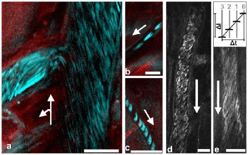 Figure 1. Intravital THG imaging of blood flow in the mouse cremaster muscle.Images were scanned with lines from top to bottom and line addition from right to left. Arrows indicate direction of blood flow. All scale bars 20 µm. (a) Combined SHG (red) and THG (cyan) image with mirror-enhanced signals [29]. In the left vessel, RBCs flow with the direction of added scan lines, therefore some are elongated to intense streaks. Image brightness was adjusted to allow simultaneous visualization of low and high intensities with a gamma value of 2. (b) Flow in this capillary was with the scan direction from right to left, therefore RBCs appear elongated. (c) Flow in this capillary was against scan direction, from left to right, RBCs therefore appear much shorter (compare scale bars). (d) RBCs flowing in a â¼25 µm vessel. RBC shapes in the image are optically deformed by the relation of blood flow velocity and the scanning process (see main text). (e) THG recording of RBCs suitable for blood flow velocity measurement. Scheme on top illustrates the principle with scanlines 0â3, see Methods for details. In the example shown scan speed was 800 lines per second, the temporal distance between two lines was thus 1.25 ms. Pixel size was 0.31 µm. Blood flow velocity was determined to be 0.75 mm/s.
