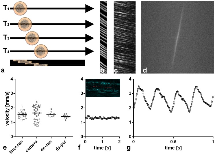 Figure 2. THG line scanning in the mouse cremaster muscle.(a) Scheme of the process. Erythrocytes passing by cause a signal in each of the four sequentially scanned lines, recorded at time points T1 to T4. Lines are put together in an x-t-representation (bottom). Here, each erythrocyte moving along the scanned line shows a continuously advancing position, resulting in a streak of signal with a measurable angle. The orientation of the individual lines is the same in all following x-t-representations. (b) x-t-representation from a capillary, (c–f): Comparison of various evaluations on the same 30 µm cremaster venule. (c) x-t-representation. (d) Fourier-transformation of the x-t-representation which is partly shown in c. The calculated average velocity in this example was 1.5 mm/s. (e) Comparison of velocities measured with THG line scan visualized in C (1.56 mm/s±0.22 s.d.) and with fluorescent beads and a camera (1.65 mm/s±0.50 s.d., Figure S1) in the same venule. Horizontal lines indicate mean values. Double line scans (ds) scanned two parallel lines alternately, with ds-cen more centrally (1.56 mm/s±0.17) and ds-per more peripherally (1.41 mm/s±0.12). Note higher velocity in ds-cen (p = 0.037, t-test). (f) LS-PIV measurements with the line scanning data set visualized in C. Two of seven seconds continuous run are shown with a data point every 16 ms. Average speed was 1.3 mm/s±0.07 s.d. The inset shows the position of the scan line (red) in this venule, visualized by THG. (g) LS-PIV measurements at the center of a 50 µm arteriole from the same cremaster muscle with a data point every 3 ms. Mean velocity over 11.9 seconds (19895 data points) was 2.35 mm/s, heart rate was ∼250 beats/min.