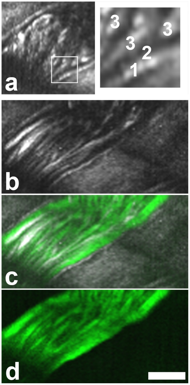 Figure 5. Visualization of the cell free layer in the cremaster muscle by THG with mirror-enhanced signals[29]. (a) RBCs are excluded from a gap near the vessel wall. Boxed area magnified on the right. 1, vessel wall. 2, THG free gap. 3, RBC tracks. (b–d) Image of the same area after injection of fluorescently labeled 40 kDa dextran. THG in gray (b,c), dextran fluorescence in green (c,d). The THG free gap is unchanged in width. Contrary to the erythrocytes, this small dextran infiltrates the cell free layer. Scale bar 20 µm. A movie of this vessel is shown in Movie S1.
