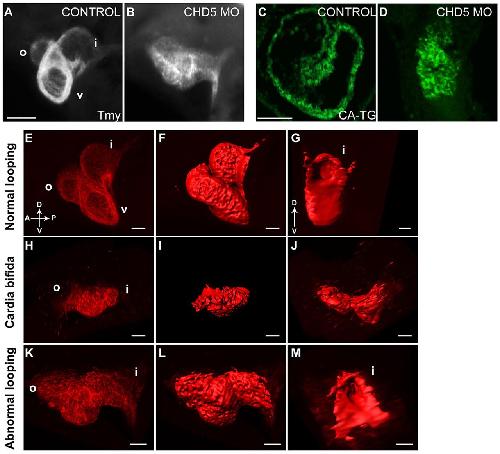 Fig. 2. CHD5 is required for cardiac morphogenesis. (A,B) CHD5-depleted embryos (stage 37) exhibit smaller, improperly looped hearts that fail to undergo chamber formation. Lateral views of whole-mount antibody staining with anti-tropomyosin (Tmy) antibody. (C,D) CHD5-depleted hearts fail to develop fully formed chambers and have a thicker myocardial layer. Transverse sections of cardiac actin-EGFP transgenic (CA-TG) Xenopus embryos (stage 37). (E-M) 3D reconstructions of early tadpole Xenopus embryos (stage 37) stained with anti-tropomyosin antibody viewed laterally and posteriorly. CHD5-depleted hearts (H-M) fail to complete migration and fusion (H-J, 54%), or fail to undergo proper looping and chamber formation (K-M, 31%). Only 15% display normal looping. n>25 per condition, two biological replicates. v, ventricle; o, outflow tract; i, inflow tract. D, dorsal; A, anterior; V, ventral; P, posterior. Scale bars: 100â μm in A-D; 50â μm in E-M. |