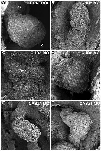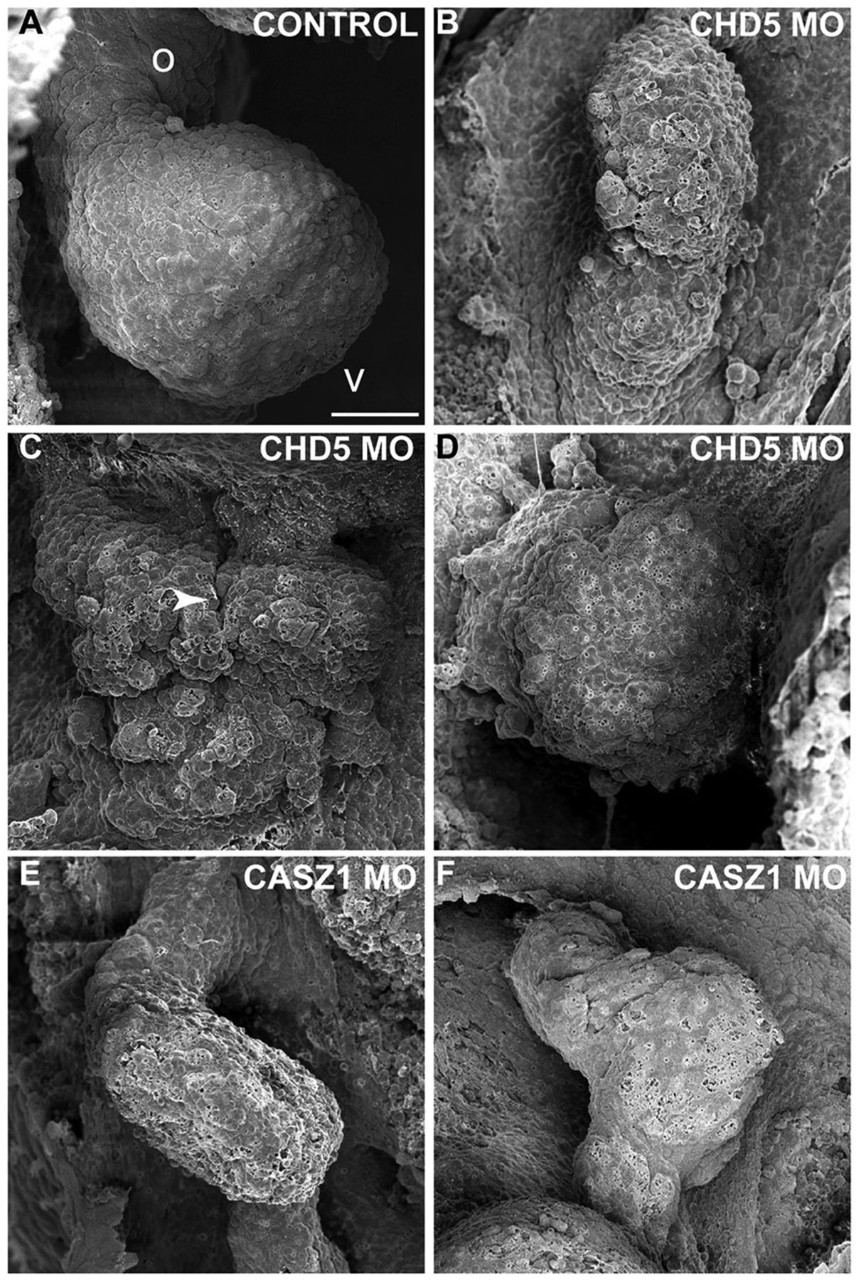 Fig. 3. CHD5 is required for cardiac morphogenesis. (A-D) Scanning electron microcopy (SEM) of Xenopus embryos at early tadpole stage (stage 37) in (A) control and (B-D) CHD5-depleted embryos. CHD5-depleted embryos fail to complete looping and begin chamber formation, and fail to undergo normal cell shape changes associated with development and maturation of the linear heart tube. o, outflow tract; v, ventricle. Arrowhead indicates failure of cardiomyocyte fusion at ventral midline. (E,F) CASZ1-depleted embryos exhibit similar defects in cardiac looping and cardiac cell shape changes. n=10 per condition, two biological replicates. Scale bar: 50â μm. |