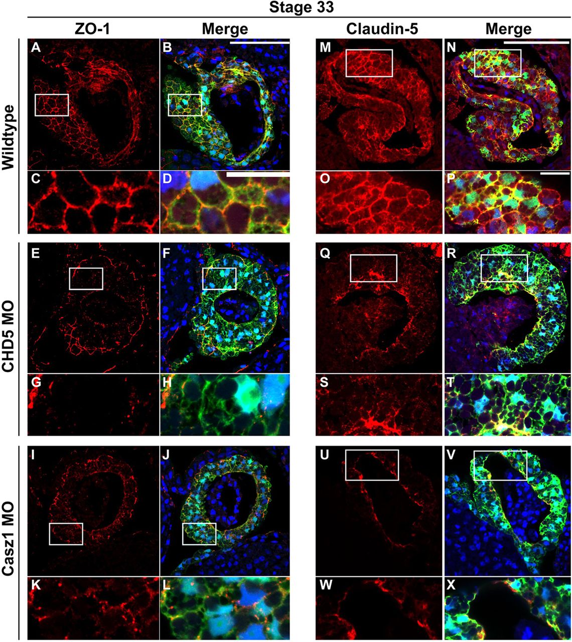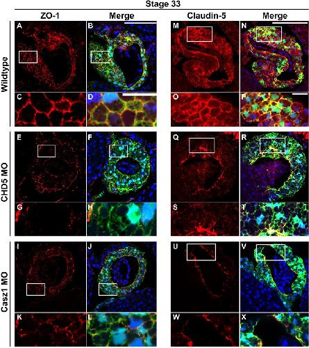 Fig. 6. CASZ1 and CHD5 are required for myocardial tissue adhesion prior to cardiac looping and chamber formation. (A-X) Control, CHD5-depleted and CASZ1-depleted CA-GFP embryos were examined for expression of the tight junction markers ZO-1 (A-L) and claudin-5 (M-X). Expression of both ZO-1 and claudin-5 is reduced and appears diffuse and unorganized in transverse sections of CHD5- and CASZ1-depleted hearts (stage 33). Phenotypes represented across multiple sampled embryos (nâ¥4). White boxes in A,B,E,F,I,J,M,N,Q,R,U,V correspond to magnified images in C,D,G,H,K,L,O,P,S,T,W,X, respectively. Merge represents ZO-1 or claudin-5 (red), DAPI (blue) and CA-GFP (green). Scale bars: 100â µm in A,B,E,F,I,J,M,N,Q,R,U,V; 20â µm in C,D,G,H,K,L,O,P,S,T,W,X. |