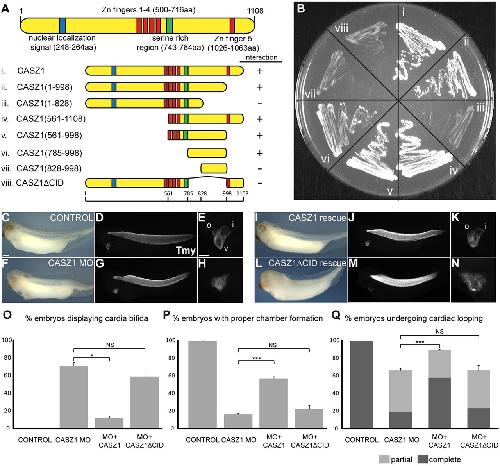 Fig. 7. CHD5 is crucial for CASZ1 function. (A,B) The region of CASZ1 containing the minimal CHD5-interacting domain amino acid residues 785-998 was identified using a yeast two-hybrid assay. (C-N) Control (C-E) and CASZ1-depleted (F-H) Xenopus embryos compared with CASZ1-depleted embryos co-injected with mRNA encoding either full-length CASZ1 (I-K) or CASZ1δCID (L-N) at early tadpole stage (stage 37). Full-length CASZ1 partially rescued cardiac looping and chamber formation (v), and outflow tract (o) and inflow tract (i) formation, whereas CASZ1δCID failed to rescue any aspect of cardiogenesis. (O-Q) Three independent experiments (n>20 per condition) of embryos were scored for cardia bifida (O), degree of proper cardiac looping (P) and chamber formation (Q) using whole-mount staining with anti-tropomyosin antibody. Fisher's exact test was performed for significance: NS, not significant; *P=0.003; ***P<0.0001. Error bars represent calculated s.e.m. Scale bars: 500â μm in C,D, F,G,I,J,L,M; 100â μm in E,H,K,N. |