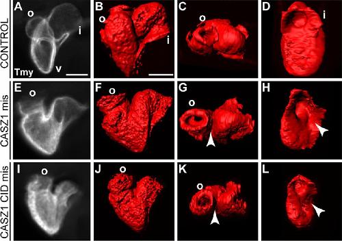 Fig. 8. The CASZ1 CID domain disrupts heart development. (A-D) Control embryos at early tadpole stage (stage 37) exhibit looping and formation of the cardiac chambers. v, ventricle; o, outflow tract; i, inflow tract. (E-L) CASZ1 and CASZ1 CID misexpressing embryos display incomplete convergence of the outflow and inflow tract, as seen in dorsal views (I,K) (arrowheads), and a partially closed inflow tract, as seen in posterior views (H,L) (arrowheads). n=23 for CASZ1 mis; n=29 for CASZ1 CID mis; two biological replicates. Scale bars: 100â μm. |
