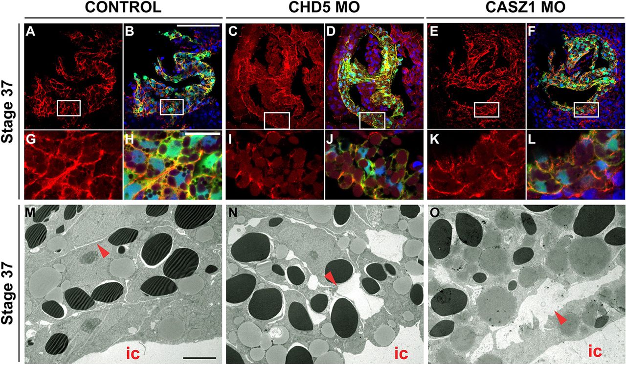 Fig. 4. CHD5 and CASZ1 are required for myocardial tissue adhesion. (A-L) Transverse sections of CHD5 and CASZ1-depleted CA-GFP embryos (stage 37) display diffuse or reduced expression of ZO-1, indicating defects in tight junction formation. Phenotypes represented across multiple sampled embryos (nâ¥4, from two biological replicates). Boxes in A-F outline magnified images in G-L. Merge represents ZO-1 (red), DAPI (blue) and CA-GFP (green). (M-O) TEM imaging of transverse sections of control, CHD5-depleted and CASZ1-depleted myocardium (stage 37) reveal large intercellular gaps between cardiomyocytes (arrowheads) adjacent to the inner myocardial chamber (ic) in both CHD5-depleted and CASZ1-depleted embryos compared with control embryos (nâ¥2, from two biological replicates). Scale bars: 100â μm in A-F; 20â μm in G-L; 5â μm in M-O. |