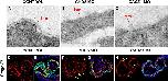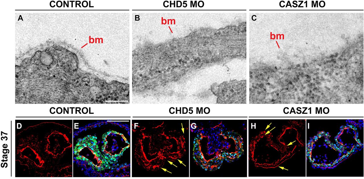 Fig. 5. CHD5 and CASZ1 are required for deposition of myocardial basement membrane. (A-C) The basement membrane (bm) forms as a discontinuous membrane on the basal surface of the myocardium in CHD5- and CASZ1-depleted embryos, as shown by TEM imaging (stage 37) (n=2). (D-I) CHD5- and CASZ1-depleted CA-GFP hearts (stage 37) exhibit areas of depleted or improperly localized laminin (yellow arrows). Phenotypes represented across multiple sampled embryos (nâ¥4, from two biological replicates). Merge represents laminin (red), DAPI (blue) and CA-GFP (green). Scale bars: 0.2â μm in A-C; 100â μm in D-I. |