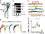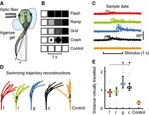 Figure 3. Experiments in partially immobilised animals. (A) General view of the preparation, with the animal partially immersed in agarose gel, and an optic fiber placed near the eye. (B) Simplified representation of stimuli presented to the animal. Here ‘flash’ or ‘f’ represents an abrupt change in lightness, ‘ramp’ or ‘r’ represents a gradual change, ‘grid’ or ‘g’ stands for an array of linearly expanding squares, ‘crash’ or ‘c’ stands for a linearly expanding circle, and ‘control’ stands for the absence of a visual stimulus. (C) Typical responses (tail deflections) to these stimuli. (D) Sample swimming trajectory reconstructions for different stimuli; black circles mark the response onset. (E) Average ‘distances virtually traveled’ for every animal, in response to different stimuli (see 2); boxes represent medians, black whiskers show the interquartile range, and gray lines and asterisks indicate comparisons with ‘flash’ with PW < 0.05.