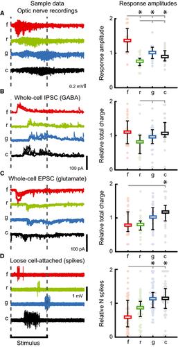 Figure 4. Typical responses to visual stimuli recorded at different points in the visual system, and their relative cumulative response amplitudes. (A) Recordings from the optic nerve. (B and C) Whole-cell recordings in the OT for inhibitory and excitatory currents, respectively. (D) Spiking output of the OT cells. In every panel ‘f’ stands for ‘flash’, ‘r’ for ‘ramp’, ‘g’ for ‘grid’, and ‘c’ for ‘crash’. For relative response amplitudes (right column) all measurements are shown as gray circles, together with medians represented by boxes, and interquartile ranges. Gray lines and asterisks mark significance levels of P < 0.05 compared with response to ‘flash’. Outliers were brought into axes limits. EPSC, excitatory post-synaptic current; IPSC, inhibitory post-synaptic current.