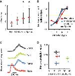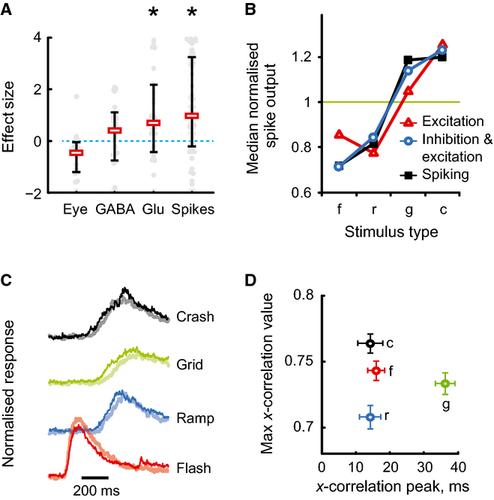 Figure 5. Role of excitation in inhibition in looming stimulus selectivity. (A) Effect size (difference between responses to ‘crash’ and ‘flash’, divided by trial-to-trial variability) observed at different stages of information processing in the tadpolebrain. Left to right: recordings in the optic nerve (Eye), GABAergic inputs to OT cells (GABA), glutamatergic inputs to OT cells (Glu), and OT cell spike output (Spikes). Asterisks mark effects that are significantly larger than zero. (B) Predictions of cell spike output that are based on amplitudes of synaptic excitation and inhibition (circles) match actual median normalised spike output (black squares) better than those based on excitatory inputs alone (triangles). Stimuli were normalised by the average response across all stimulus types (similarly to Fig. 4). See details in the text. (C) Average synaptic responses to different visual stimuli, normalised by total synaptic charge, with inhibitory (pale wide line) and inverted excitatory (darker narrow line) curves superimposed. Inhibitory currents are lagging behind excitatory currents for all stimuli. (D) Average positions and values of cross-correlogram peaks for excitatory and inhibitory synaptic currents recorded in OT cells (horizontal axis represents the lag between excitation and inhibition; n = 28; whiskers represent SEM). Responses to ‘flash’ and ‘crash’ are not significantly different (PMW > 0.05). f, ‘flash’; r, ‘ramp’; g, ‘grid; c, ‘crash’.