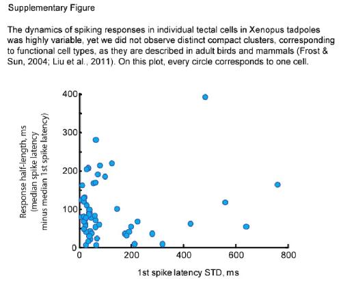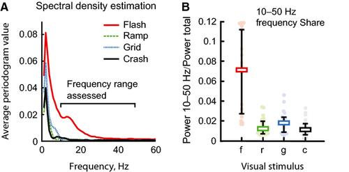 Figure 7. Temporal coding in the retina does not contribute to the looming stimulus selectivity in the tectum. (A) Average periodograms of optic nerve responses to different visual stimuli. The 10–30 Hz frequency band was prominent in responses to ‘flash’, but was absent from spectra of responses to both ‘grid’ and ‘crash’. (B) Relative spectral power of the γ-band in responses to different stimuli; the γ-band is more prominent in responses to ‘flash’ than to all other stimuli (PW < 2e−5; N = 22). f, ‘flash’; r, ‘ramp’; g, ‘grid’; c, ‘crash’.