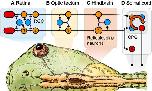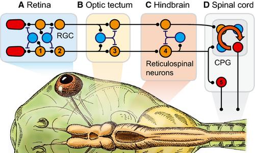 Figure 8. Conceptual model of a reverberation network acting as a collision detector (see 4 for details). In every panel the leftgrid represents a one-dimensional ‘retina’, and the rightgrid represents a one-dimensional ‘tectum’; rows correspond to discrete time steps (time running from top to bottom), and columns correspond to ‘RGCs’, or retinotopically arranged ‘tectal cells’, accordingly. Cells that spike during the current time frame are shown as dark and silent cells are pale. (A) Response to instantaneous ‘flash’. (B) Response to reversed looming, or receding stimulus. (C) Response to looming stimulus, or ‘crash’. Total cumulative spiking output in the ‘tectum’ is stronger for ‘crash’ (10 spikes) than for either ‘flash’ or receding stimulus (seven spikes each).