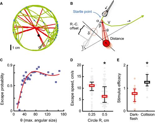 Figure 2. Behavioral experiments in freely-swimming tadpoles. (A) Trajectories of the tadpole and the visual stimulus over the course of one experiment; small dots represent points of avoidance maneuver initiation. Scaled images of a circle and a tadpole are superimposed on their respective trajectories. (B) A summary of the parameters measured for every collision (see 2 for a detailed description; R.-C. offset stands for rostro-caudal offset). (C) Escape probability as a function of visual stimulus maximal angular size during the collision event; each square represents an average of 29 events and the red line is a fourth degree polynomial fit. (D) One of the pair-wise comparisons between escapes in response to stimuli of different size. Gray circles represent data from individual collision events, boxes and whiskers show medians and interquartile ranges, and the asterisk marks statistical significance (P < 0.05). Tadpoles escaped from smaller circles at a faster speed than from larger ones. (E) Relative efficacy (probability of triggering an avoidance maneuver, normalised over the individual responsiveness of each animal), as observed in freely-swimming tadpoles, for dark circles either colliding with the animal, or instantaneously appearing near it.