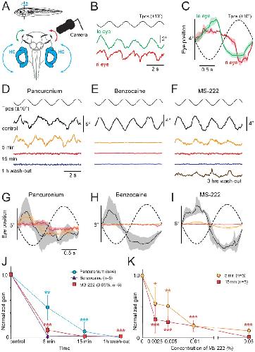 Figure 2. Effect of pancuronium, benzocaine and MS-222 on the horizontal aVOR in Xenopus tadpoles.A, Schematic of the experimental setting depicting the semi-intact preparation, horizontal sinusoidal turntable positional changes (Tpos; 0.5 Hz, ±10°) and video capture of eye motion. B,C, Single sweeps of co-aligned horizontal positional oscillations of the left (green) and right (red) eye, extracted from video sequences during turntable rotation (B) and average responses (± SEM, shaded areas; n = 8) over a single cycle (C); note that table and eye motion are oppositely directed in agreement with aVOR behavior. D-I, Effect of bath-applied pancuronium (0.12 mg/ml, D,G), benzocaine (0.05%, E,H) and MS-222 (0.05%, F,I) on single sweeps of horizontal sinusoidal turntable motion (Tpos)-evoked eye movements (D-F) and average response (± SEM, shaded areas; n = 8, respectively) over a single cycle (dashed line; G-I); recordings (same color code in G-I) were obtained before (Control, black traces), 5 min (orange traces) and 15 min (red traces) after onset of drug application as well as 1 hour (blue traces, D-F) and 3 hours after beginning of the wash-out (brown trace, F). J, Progression of pharmacological influence on eye motion gain (ratio of eye/table motion magnitude) after application/wash-out of pancuronium, benzocaine and MS-222. K, Dose-response curve of MS-222 impact on the gain of rotation-induced eye motion 5 and 15 min after drug application; the significance of difference in J,K is indicated: *, p≤0.01; **, p≤0.001; ***, p≤0.0001, with respect to control values. Calibration bars in D,G also apply to E,F and H,I, respectively. |