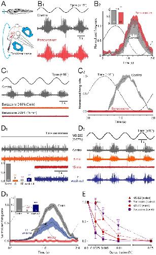 Figure 3. Effect of pancuronium, benzocaine and MS-222 on extraocular motoneuronal discharge in Xenopus tadpoles.A, Schematic of the experimental setting depicting the semi-intact preparation, roll-axis turntable positional changes (Tpos, 0.5 Hz, ±10°) and extracellular recordings of spontaneous and motion-evoked multiple-unit discharge of the superior oblique (SO) eye muscle-innervating trochlear nerve. B-D, Single sweeps of sinusoidal roll motion (Tpos)-evoked discharge modulation (B1,C1,D2), spontaneous firing of the trochlear nerve (D1) and average firing rate modulation (± SEM, shaded areas) over a single cycle (dashed line; B2,C2,D3) before (Control, gray traces and plots), 5 min (orange traces and plots), 15 min (red traces and plots) and after wash-out (blue traces and plots) of bath-applied pancuronium (0.12 mg/ml, B), benzocaine (0.05%, C) and MS-222 (0.05%, D); inset in B2 shows relative peak firing rates before (gray) and after pancuronium application (red); insets in D1,3 show relative resting rates (D1) and peak firing rates during roll motion stimulation (D3) before and during drug application and after wash-out; number of experiments in parentheses in insets; while no significant change (n.s., p = 0.975) of the peak firing rate occurred after adding pancuronium to the bath (B), benzocaine (C) and MS-222 (D) blocked the motor responses entirely (***, p≤0.0001). E, Dose-response curve of benzocaine and MS-222 (n = 20, respectively) on spontaneous and motion-triggered peak modulation values of multiple-unit trochlear motor spike discharge. |