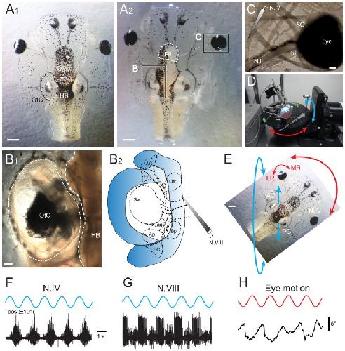 B1,2) and extraocular neuromuscular system (i.e. N.IV motor innervation of the SO eye muscle in C) accessible for extracellular single- and multiple-unit recordings and bath-application of drugs; further removal of the entire hindbrain (HB, white dashed line in B1) yielded access to the peripheral part of the N.VIII for electrophysiological recordings of afferent fibers innervating the different vestibular sensory endorgans in the otic capsule (B2). D,E, A computer-controlled turntable (D) allowed spatially specific application of sinusoidal rotational stimuli of semi-intact preparations in the horizontal (red arrows) and vertical planes (e.g. left AC - right PC, blue arrows in E). F,G, Typical multiple-unit discharge modulation, recorded from N.IV (trochlear nerve, F) and the anterior branch of N.VIII (vestibular nerve, G) during 5 cycles of rotation (0.5 Hz) in the AC - PC plane, illustrated in E. H, In vitro optical motion recording of the left eye (E) during 5 cycles of rotation in the horizontal plane (0.5 Hz). Scale bar is 1 mm in A1,2 and 0.2 mm in B1,C; calibration bar and positional excursion amplitude of the rotational stimulus in F also apply to G,H; AC, PC, anterior, posterior vertical semicircular canal; LR, MR, SR, lateral, medial, superior rectus eye muscle; SO, superior oblique eye muscle; OT, optic tectum, Tpos, table position. |