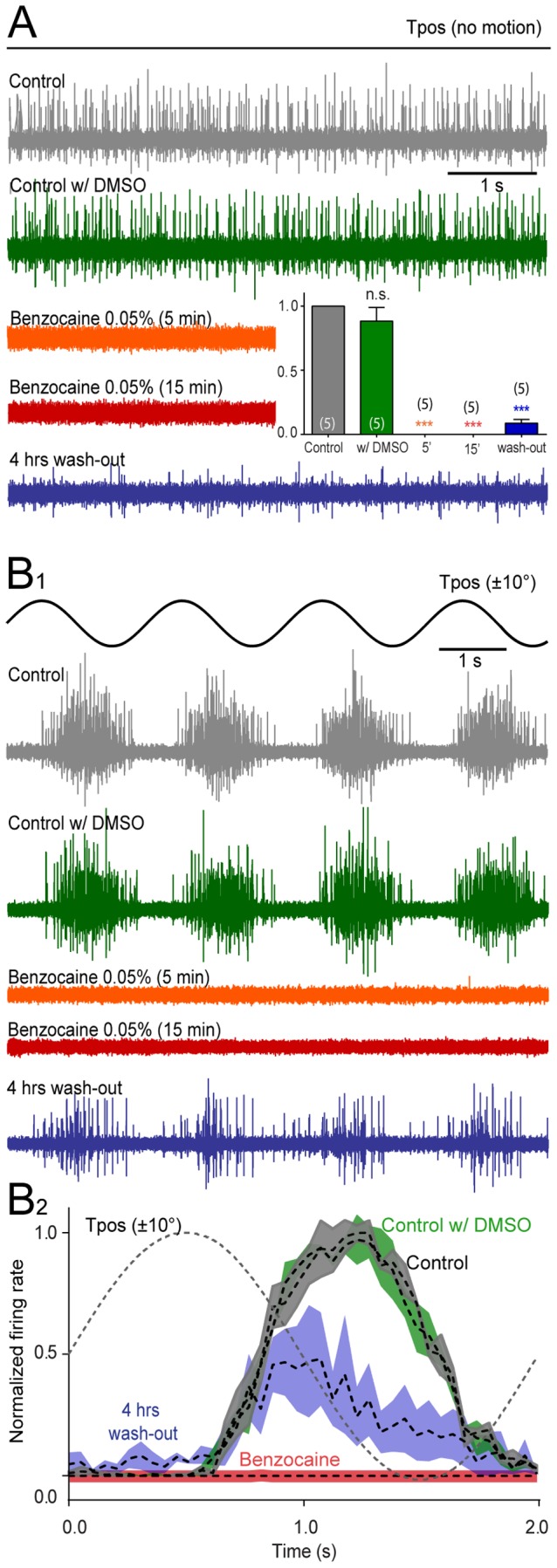 Figure 4. Effect of benzocaine on extraocular motoneuronal discharge in Xenopus tadpoles.A-B, Single sweeps of spontaneous (A), roll motion (Tpos)-evoked (B1) multiple-unit discharge of the superior oblique (SO) eye muscle-innervating trochlear nerve and average firing rate modulation (± SEM, shaded areas; B2) over a single cycle (dashed line; B2) before (Control, gray traces and plot), 10 min after application of dimethylsulfoxide (Control w/DMSO, green traces and plot), 5 min (orange traces) and 15 min after application of benzocaine (0.05%; red traces) and four hours after wash-out (blue traces and plot); inset in A show relative resting rates before (gray), in the presence of DMSO (green), benzocaine (orange and red, complete block) and after wash-out (blue); number of experiments in parentheses; while no significant change (n.s., p = 0.880) of the peak firing rate occurred after adding DMSO to the bath, benzocaine (0.05%) blocked the motor responses entirely (***, p≤0.0001). |