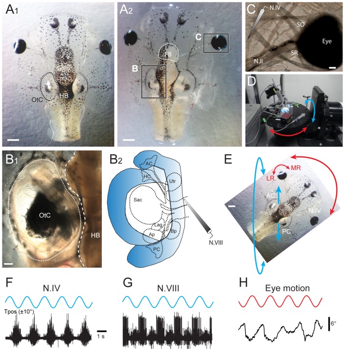 A-C, Photomicrographs, depicting an isolated head of a Xenopus laevis tadpole before (A1) and after opening of the dorsal cranium (A2) and removal of the skin to disconnect the forebrain (FB, white dotted line in A2) and to make the brainstem, otic capsule (OtC in A1,