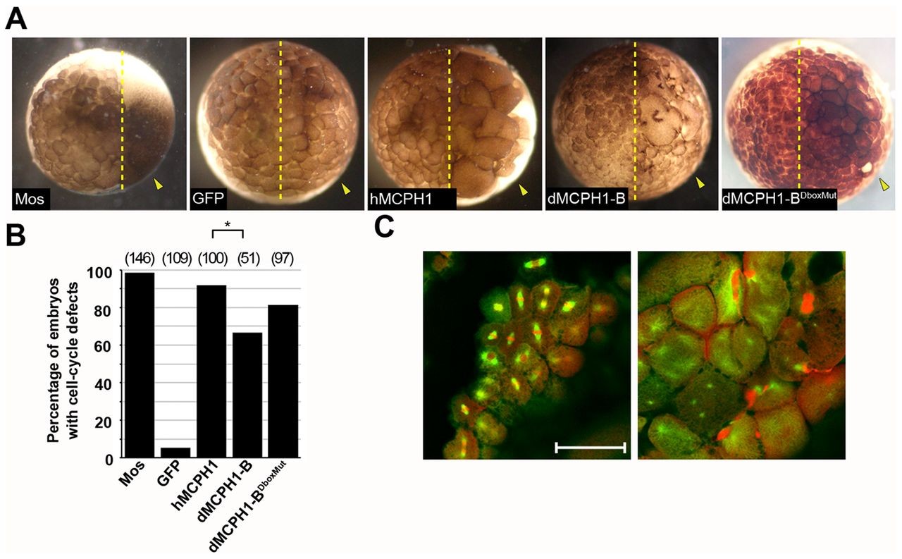 Fig. 4. Overexpression of dMCPH1-B or hMCPH1 results in cell-cycle defects. (A) Representative images of whole Xenopus embryos fixed four hours after injection of Mos, GFP, full-length human MCPH1 (hMCPH1), dMCPH1-B, or dMCPH1-BDboxMut RNA at the 2â4-cell stage. Arrows indicate injected halves of embryos. (B) Quantification of Xenopus embryos displaying cell division defects 4â hours post-injection. Total number of embryos injected is indicated in parentheses. *p<0.005 (C) Confocal sections of the uninjected (left) and injected (right) areas of a representative whole embryo following injection with hMCPH1 mRNA. Microtubules, green; DNA, red. Scale bar: 100 µm.