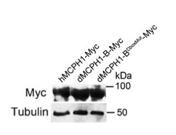 Fig. S3. Xenopus embryos express hMCPH1-Myc, dMCPH1-B-Myc, and dMCPH1-BDboxMut-Myc at similar levels. Immunoblot for Myc and tubulin (loading control) of lysates derived from Xenopus embryos after injection with mRNA encoding hMCPH1-Myc, dMCPH1-B-Myc, or dMCPH1-BDboxMut-Myc.
