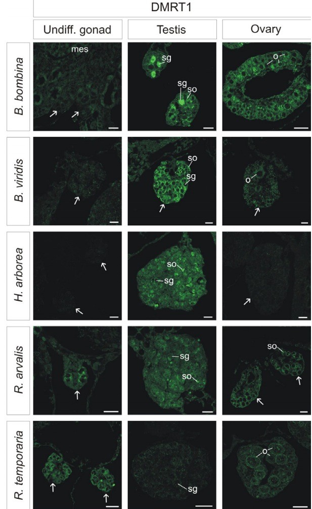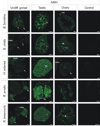 Sexual dimorphism of AMH, DMRT1 and RSPO1 localization in the developing gonads of six anuran species.