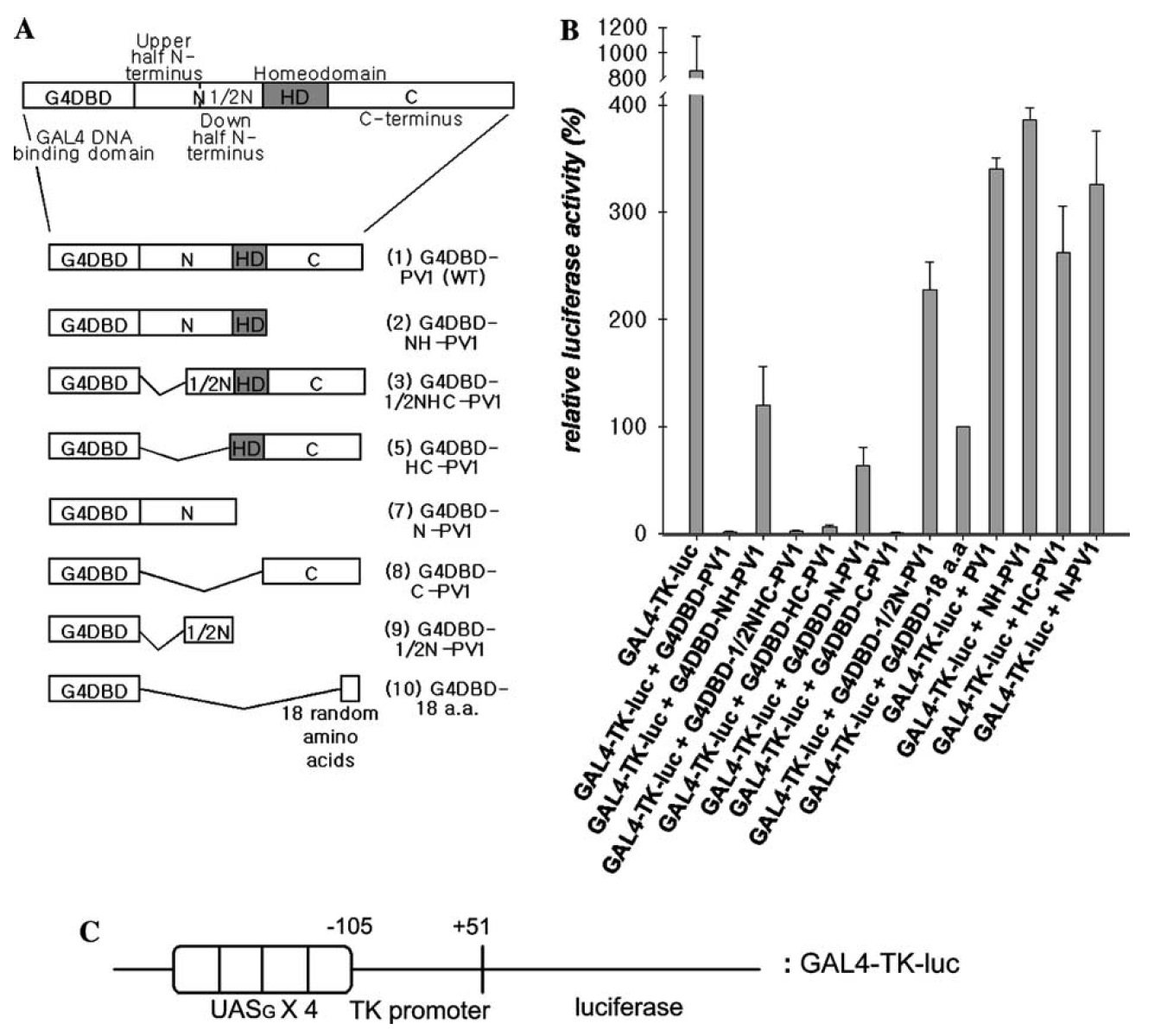 PV.1, a homeotic protein, ventralizes dorsal mesoderm and inhibits neuralization by mediating BMP-4 signaling in Xenopus embryo. In our previous report antimorphic PV.1 causes a secondary axis by inducing the ectopic organizer. We analyzed the structure of this transcription factor through domain level assessment. In a phenotype-inducing test, half of the N-terminus at the N-terminal side was unessential for inducing ventralization of embryos. We examined the transacting activity of several regions of PV.1 utilizing GAL4 hybrid system. The C-terminal region/GAL4DBD (DNA binding domain) exhibited strong repressive activity on a reporter gene (operator/promoter/reporter; Gal4-TK-luc) as much as the whole polypeptide/GAL4DBD, whereas the N-terminal region/GAL4DBD showed only modest repression. The results suggest that PV.1 functions as a transcriptional repressor and this repressive activity is localized mostly to the C-terminal region. Additional characterizations of N- and C-terminus with respect to the effects on the expression of other genes are described.