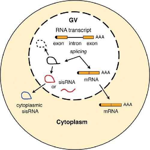 FIGURE 7. Diagram of a Xenopus oocyte showing proposed origin of nuclear and cytoplasmic sisRNAs.