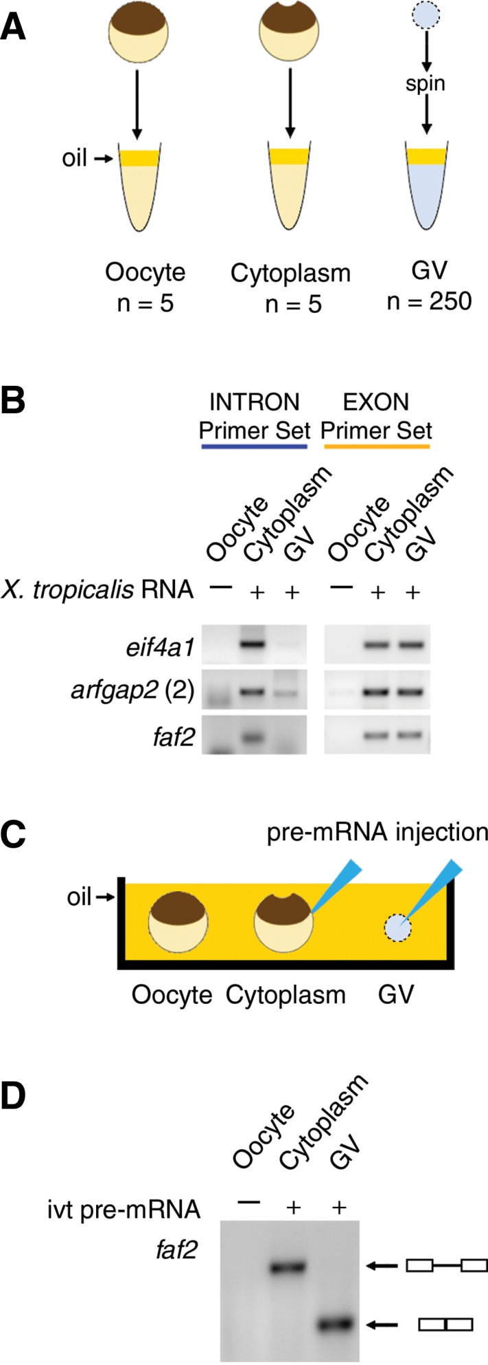 FIGURE 4. (A,B) The stability of X. tropicalis cytoplasmic RNA (1 µg) was tested by RT–PCR after incubation in X. laevis cytoplasmic or nuclear extracts. (A) Extracts of X. laevis whole oocytes, oocyte cytoplasm, and GVs were made under oil. (B) Cytoplasmic sisRNAs from X. tropicalis were degraded by a GV extract from X. laevis but not by a cytoplasmic extract (intron primer set, blue). Exonic sequences from X. tropicalis were stable for 2 h in both GV and cytoplasmic extracts (exon primer set, yellow). (C,D) Splicing activity was tested by injecting an in vitro-transcribed X. tropicalis pre-mRNA construct into the cytoplasm or GV of an X. laevis oocyte. (C) Injection of the construct was carried out under mineral oil. (D) After incubation for 2 h, an RT–PCR reaction was carried out on the cytoplasm and GV using primers from the ends of the construct. The products were run on an agarose gel and stained. Splicing occurred only in the GV, as shown by the expected smaller size of the RT–PCR product.