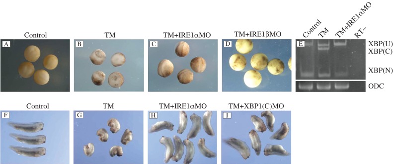 Fig. 2. Developmental defects caused by tunicamycin (TM) were rescued with the injection of IRE1αMO and xXBP1(C) MO.A: control MO injected embryos at stage 18. B: embryos treated with 2â μg/mL TM at stage 18. C: embryos treated with 2â μg/mL TM and injected with 50 ng IRE1αMO at stage 18. D: embryos treated with 2â μg/mL TM and injected with 50 ng IRE1βMO at stage 18. E: rescue effect on XBP1 splicing. TM treatment led to an increase of xXBP1(C) while TM treatment together with xIRE1α MO injection rescued the change in embryos at stage 11. F: control MO injected embryos at stage 32. G: embryos treated with 2â μg/mL TM at stage 32. H: embryos treated with 2â μg/mL TM and injected with 50â ng IRE1αMO at stage 32. I: embryos treated with 2â μg/mL TM and injected with 50 ng XBP1(C) MO at stage 32. RT-: no-reverse transcriptase control.