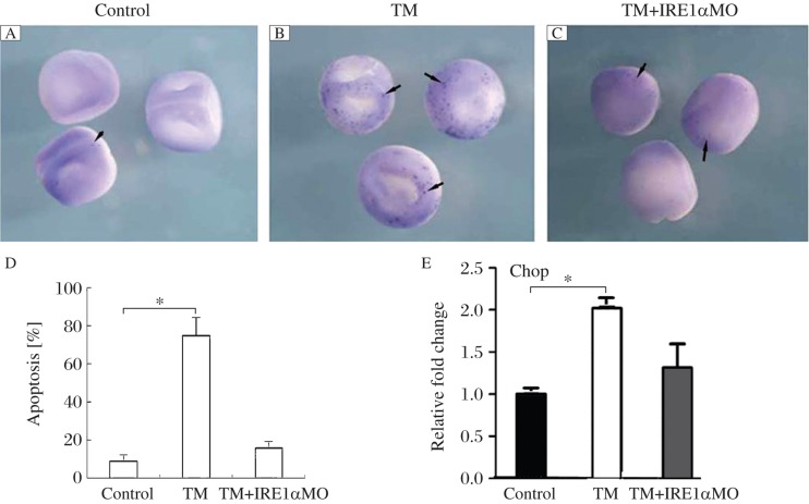 Fig. 4. xIRE1α knockdown rescued the apoptosis in embryos of stage 18 with TM treatment by TUNNEL.A: The control embryos without TM treatment showed few staining indicating apoptosis (arrow). B: The TM-treated embryos showed significant signal for apoptosis (arrows). C: The embryos were injected with 50 ng of IRE1αMO at 4 cell stage, then treated with TM, and the apoptotic signal was decreased (arrows). D: A quantitative presentation is given. E: Expression of CHOP is inhibited in TM-treated embryos and rescued by xIRE1α knockdown. *P < 0.05 compared with control embryos.