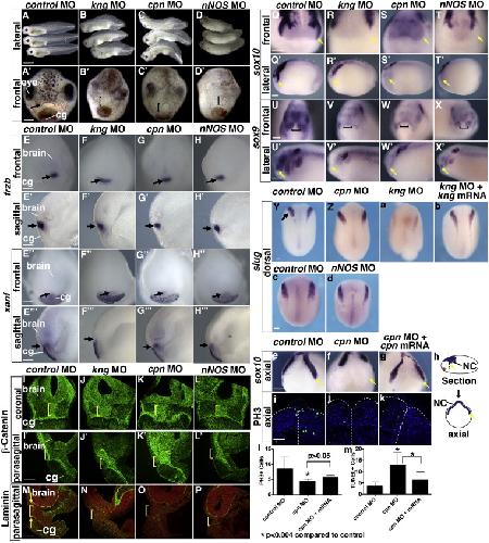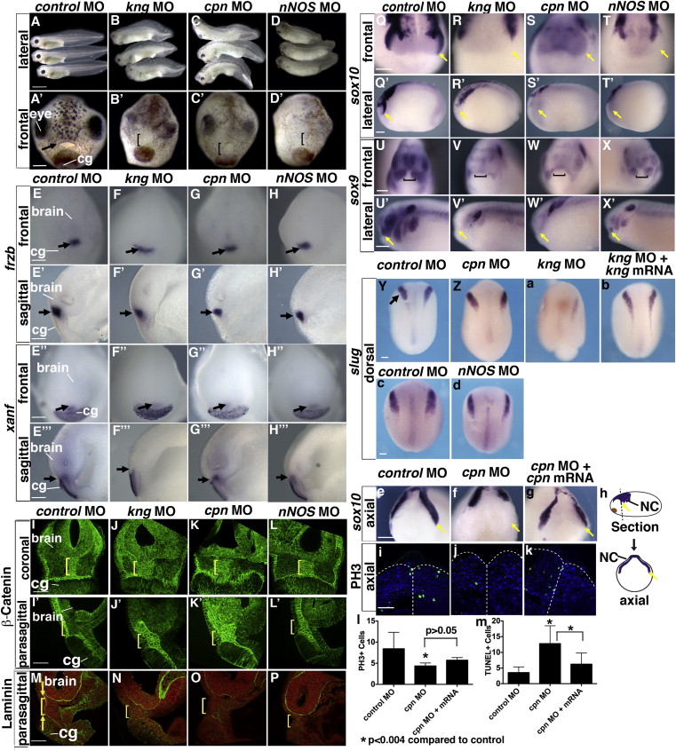 Figure 2. kng, cpn, and nNOS Are Required for Mouth Opening and Face Formation (AâDâ²) kng, cpn, and nNOS loss of function (LOF) using antisense morpholinos. Embryos assayed at stage 40, in four independent experiments. Arrow: mouth region. Bracket: unopened mouth. cg, cement gland. Scale bar in (AâD), 2,000 μm. Scale bar in (Aâ²âDâ²), 200 μm. (A and Aâ²) Control morphants (100% normal, n = 97). (BâDâ²) kng, cpn, and nNOS morphants (kng [Bâ²] 0% normal, n = 102; cpn [Câ²] 2% normal, n = 105; nNOS [Dâ²] 0% normal, n = 129). (EâHâ²â²â²) Kinin-Kallikrein pathway morphants at stage 22 express presumptive mouth markers, frzb1 and xanf1. Scale bars, 200 μm. (IâP and Iâ²âLâ²) Histology of kng, cpn, and nNOS LOF. Coronal sections (IâL, control morphant 100% normal, n = 5; each Kinin-Kallikrein morphant, 0% normal, n = 9) assayed at stage 26 in two independent experiments with β-catenin immunolabeling. Parasagittal sections with anterior to the left (Iâ²âLâ², control morpholino 100% normal, n = 5; each Kinin-Kallikrein pathway morpholino, 0% normal, n = 12). (MâP) Parasagittal sections with laminin immunolabeling (MâP) assayed at stage 26 in two independent experiments (control morphant 100% normal, n = 10; each Kinin-Kallikrein morphant 8% normal, n = 12). β-catenin: green; laminin: green; nuclear propidium iodide: red. Bracket: presumptive mouth region. cg, cement gland. Scale bar, 170 μm. (QâXâ²) kng, cpn, and nNOS morphants showed reduced expression of neural crest markers sox10 and sox9. (QâTâ²) sox10 in situ hybridization at stage 22. (UâXâ²) sox9 in situ hybridization at stage 26. Bracket: cranial NC-free midline region. Arrow: normal extent of first arch cranial NC. Scale bars in (Q)â(X), 200 μm; scale bars in (Qâ²)â(Tâ²), 800 μm; scale bars in (Uâ²)â(Xâ²), 400 μm. (Yâd) kng morphants showed reduced expression of slug at stage 22, whereas cpn and nNOS morphants and kng morphants coinjected with kng mRNA showed control slug levels. Arrow: specified neural crest. Dorsal view. Scale bars, 800 μm. (eâm) Cell proliferation and death in cranial NC cells. (eâg) sox10 in situ hybridization at stage 22 in axial section. Control and cpn morpholino plus cpn mRNA embryos showed normal expression, whereas cpn morphants had reduced expression. Scale bar, 200 μm. (h) Schematic demonstrating axial section. (iâk) Ph3 staining of axial sections show increased positive cells in control (i) relative to cpn morphants (j). Embryos injected with cpn morpholino plus cpn mRNA (k) had more Ph3-positive cells than cpn morphants. Scale bar, 170 μm. (l and m) Quantification of Ph3 and TUNEL staining, with SD included. p value: one-way ANOVA with multiple comparisons. |