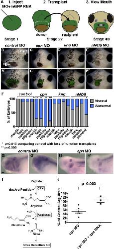 Figure 5. Local cpn Expression Is Required for Mouth Opening Local requirement of kng, cpn, and nNOS expression tested with EAD transplants. (A) Experimental design: donor morphant tissue was transplanted to uninjected sibling recipients. (B–E′) EAD transplant outcome from control, cpn, kng, or nNOS morphant donor tissue (control [B] 100% normal, n = 11; cpn [C] 28% normal, n = 14; kng [D] 83% normal, n = 24; nNOS [E] 61% normal mouth phenotype, 72% normal facial phenotype, n = 18). (B′–E′) Overlay of (B)–(E) with GFP fluorescence indicating donor tissue. Dots surround open mouths. Bracket: unopened mouth. Frontal view. Scale bar, 100 μm. (F) Quantification of structure depending on morphant background of facial tissue. (G–H′) sox9 expression in cpn morphant donor tissue transplants, compared with control morphant transplants. sox9 in situ hybridization in control morphant transplants (G, G′, 70% with normal expression, n = 10) and cpn morphant transplants (H and H′, 36% with normal expression, n = 11). Two representative embryos shown. Scale bar, 100 μm. (I and J) (I) Summary of urea assay for analysis of Cpn activity. (J) Chart summarizing level of urea derived from free Arg in cpn morphants or morphants coinjected with cpn RNA, as percent of urea derived from free Arg in control morphants. Urea levels in control morphants and wild-type embryos were equivalent. Each dot represents an independent experiment. p value: one-tailed t test. |
