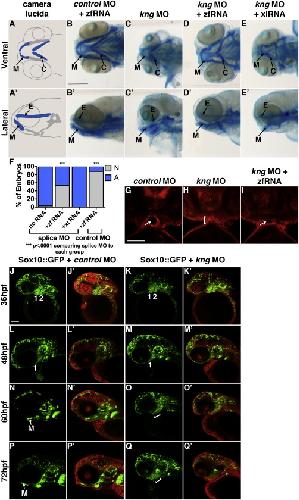 Figure 7. Function of kng in Craniofacial Development Is Conserved in Zebrafish (A and A′) Camera lucida of facial cartilages. E, ethmoid plate; C, ceratohyal cartilage; M, Meckel’s cartilage. (B–E′) kng loss of function using splice morpholinos and rescue with zebrafish (zf) kng mRNA. Embryonic cartilage scored at 5 dpf after Alcian blue staining in three independent experiments. Scale bar, 250 μm. (B and B′) Control morphants coinjected with mRNA were normal (88% normal, n = 50). (C, C′, E, and E′) kng morphants and kng morphants coinjected with 200 ng Xenopus kng mRNA showed abnormal facial cartilage. Meckel’s cartilage was truncated, boxy, and pointed at an abnormal angle. The ceratohyal cartilage was positioned at an abnormal angle, perpendicular to the midline. (kng [C and C′] 3% normal, n = 61; kng mo plus frog mRNA [E and E′] 0% normal, n = 65). (D and D′) kng morphants coinjected with 200 ng zebrafish (zf) mRNA showed partial rescue. Embryos scored as partially rescued if Meckel’s cartilage was longer, more rounded, and pointed dorsally and if ceratohyal cartilage pointed more anteriorly, compared to kng morphants (54% partial rescue, n = 89). (F) Quantification of phenotypes. p values: one-tailed Fisher’s exact test. N, normal or partially rescued phenotype. A, abnormal phenotype. (G–I) Ventral views of mApple-injected embryos at 48 hpf. White arrow: open mouth. White bracket: closed mouth. Scale bar, 100 μm. (G) Control morphants (100% normal, n = 5). (H) kng splice morphants failed to form open mouths (0% normal, n = 6). (I) kng splice morphants coinjected with 200 ng zf mRNA had open mouths (67% normal, n = 6). (J–Q′) Confocal images of Sox10::GFP zebrafish coninjected with 75 pg mApple and 4 ng control morpholino (100% normal, n = 5) or 4 ng kng splice morpholino (0% normal, n = 5). Paired images of the same embryo show GFP signal alone and GFP with mApple. Numbers indicate pharyngeal arches (PA). Bracket: uncondensed/disorganized cartilage. Lateral view. M, Meckel’s cartilage. Scale bar, 100 μm. (J–K′) At 36 hpf, NC has migrated into the face of both morphant and control embryos to form first and second PA. (L–M′) At 48 hpf, the first PA has begun to extend under eye to form the lower jaw in both morphant and control embryos. (N and N′) At 60 hpf, first PA has condensed into Meckel’s cartilage in control embryos. (O and O′) At 60 hpf, first PA remains disorganized in morphants and does not condense. (P and P′) At 72 hpf, Meckel’s cartilage is prominent in control embryos. (Q and Q′) At 72 hpf, cartilage of the lower jaw remains disorganized and uncondensed in morphants. |