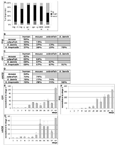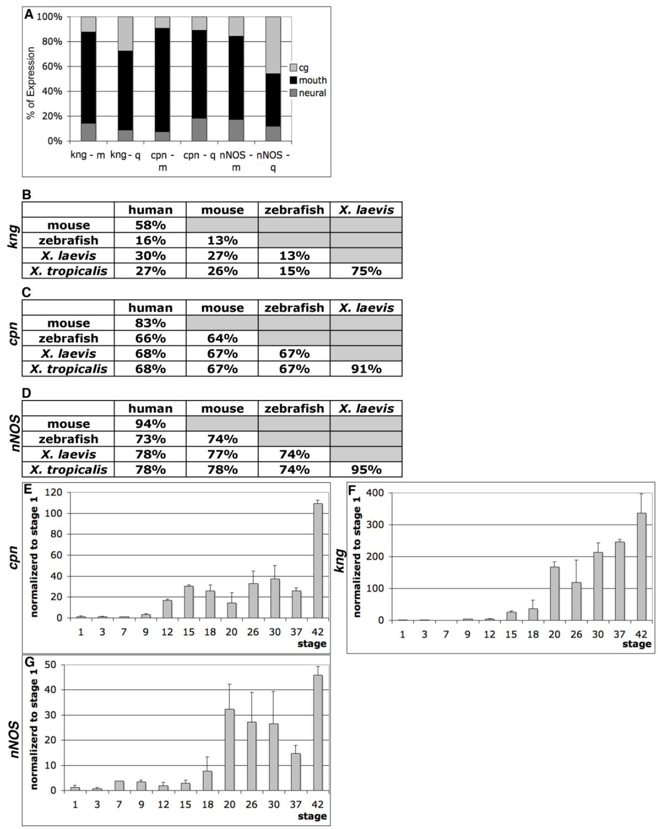 Figure S1. Temporal expression profiles, expression in the presumptive mouth and homology of protein sequences, related to Figure 1. (A) Three tissues were dissected from stage 26 heads: cg - cement gland, mouth, and brain - neural and expression of kng, cpn and nNOS were determined by microarrays - m (Dickinson and Sive, 2009) and qPCR - q. kng, cpn, and nNOS displayed 4-fold enrichment, 5-fold enrichment, and 4-fold enrichment, respectively, in the presumptive mouth region relative to surrounding tissue. (B-D) Percentage values correspond to sequence identity of protein sequences among human, mouse, zebrafish, Xenopus laevis and Xenopus tropicalis. Protein sequences were obtained from NCBI Gene. Homologs were aligned using several different algorithms (t-coffee, mafft, probcons, and muscle), with the final alignment determined by consensus as implemented by t-coffee. Phylogeny was estimated with a maximum likelihood method (proml), using default parameters, in the phylip package. (E-G) 5 embryos per biological replicate (error bars: 3 biological replicates) were collected for developmental stages from oocyte (stage 1) to swimming tadpole (stage 42). Total RNA was extracted and expression profiles of kng, cpn and nNOS were measured by qPCR. All genes showed low maternal level of expression and rapid increase of expression after mid-blastula and between stages 20 and 26. |
