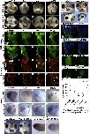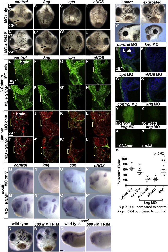 Figure 4. kng, cpn, and nNOS Loss-of-Function Phenotypes Are Prevented by the NO Donor, SNAP, and Kinin-Kallikrein Morphants Show Reduced Nitric Oxide Production that Is Increased by xBdk (AâDâ²) Facial morphology of kng, cpn, and nNOS loss of function (AâD) and with SNAP (Aâ²âDâ²). Embryos assayed at stage 40 in three independent experiments and scored as abnormal if mouth failed to open, was tiny or asymmetric, nostrils failed to form, pigment was absent, or face was abnormally narrow. Arrow: mouth region. Bracket: unopened mouth. cg, cement gland. (A) Control MO injected (98% normal, n = 427) (BâD) kng, cpn, or nNOS MO injected. (Aâ²) SNAP plus control MO. (Bâ²âDâ²) kng, cpn, or nNOS MO plus SNAP coinjection (kng [Bâ²] 85% normal, n = 105; cpn [Câ²] 86% normal, n = 98; nNOS [Dâ²] 90% normal, n = 87). Scale bars, 100 μm. (EâLâ²) Histology of kng, cpn, and nNOS LOF embryos after SNAP treatment. Parasagittal sections with anterior to left assayed at stage 26 with β-catenin (EâHâ²) and laminin immunolabeling (IâLâ²). β-catenin: green. Laminin: green, with nuclear propidium iodide: red. cg, cement gland. (EâHâ²) β-catenin in control embryos (E and Eâ²), LOF embryos (FâH), and LOF embryos coinjected with SNAP (Fâ²âHâ²) (kng [Fâ²] 100% normal, n = 5; cpn [Gâ²] 100% normal, n = 5; nNOS [Hâ²] 100% normal, n = 5). (IâLâ²) Laminin staining in control embryos (I and Iâ²), LOF embryos (JâL), and LOF embryos coinjected with SNAP (Jâ²âLâ²) (kng [Jâ²] 75% normal, n = 4; cpn [Kâ²] 80% normal, n = 5; nNOS [Lâ²] 100% normal, n = 4). Scale bars, 170 μm. (MâPâ²) Expression of sox9 RNA (in situ hybridization) after SNAP injection into kng (N, Nâ²), cpn (O, Oâ²), and nNOS (P, Pâ²) LOF embryos. Lateral view. Scale bar, 100 μm. (QâRâ²) NOS inhibitor TRIM prevents mouth formation and reduces sox9 expression. (Q and Qâ²) Wild-type embryos (100% normal, n = 6). (R and Râ²) TRIM-treated embryos (17% normal, n = 6). (Q and R) Frontal view at stage 40. (Qâ² and Râ²) Lateral view of sox9 in situ hybridization at stage 26. Scale bars in (Q) and (R), 100 μm; scale bars in (Qâ²) and (Râ²), 400 μm. (SâTâ²) Extirpated heads show open mouth and normal pigmentation at swimming tadpole (stage 41). (S and Sâ²) Control heads (96% normal, n = 27). (T and Tâ²) Isolated heads (92% normal, n = 26). (S and T) frontal view. (Sâ² and Tâ²) side view. Scale bar, 100 μm. (UâX) Fluorescence after incubation with NO sensor DAF-FM in control embryos (U), kng (V), cpn (W), and nNOS (X) LOF embryos. cg, cement gland. Sagittal view. Scale bar, 170 μm. (Yâc) Control morphant with no bead (Y). kng morphant with no bead (Z), with 9AA xBdk scrambled bead (a) or 9AA xBdk bead (b). Images collected with same exposure, gain, and fluorescent illumination. kng morphants implanted with 9AA xBdk bead displayed 50% of control florescence compared with 23% of control fluorescence in morphants treated with 9AAscr xBdk peptide. Frontal view. Scale bar, 100 μm. (c) Graph showing morphant fluorescence as percentage of control fluorescence; cpn morphants: 49%, kng morphants: 24%, and nNOS morphants: 64%. Each dot represents average of three biological replicates from independent experiments. p values: one-tailed t test. |