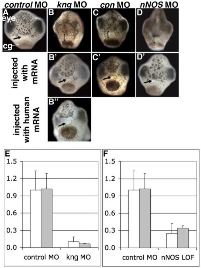 Figure S2. Morpholino specificity and efficiency, related to Figure 2. (A-D, B’-D’, B’’) The specificity of the morphant phenotypes was confirmed by rescue with 800 pg of kng mRNA (B’), 800 pg of nNOS mRNA (D’), and 1ng of cpn mRNA (C’), which does not hybridize to the start site cpn morpholino. (B’’) kng LOF phenotype was also overcome with human KNG mRNA. Embryos were co-injected using a mixture of morpholino and mRNA at the one cell stage. The craniofacial phenotype of kng, cpn and nNOS LOF was completely rescued by coinjection with mRNAs, i.e. kng (B’) 70% normal, n= 162; cpn (C’) 74% normal, n=112; nNOS (D’) 44% normal, n=94 and human kng (B’’) 32% normal, n=40. Scale bar: 200 m. Phenotypes of kng (B), cpn (C), and nNOS (D) loss of function using antisense morpholinos are described in detail in Fig. 2. When injected into control embryos alone, the kng, cpn, and nNOS RNA did not alter mouth morphology, despite the Kinin-Kallikrein GOF (data not shown). (E-F) Using qPCR, levels of kng and nNOS mRNA in LOF embryos were determined to be 6-10% and 25-34% of control levels, respectively. Two independent experiments are shown. Three independent groups of embryos (n=5 for each group) were analyzed by qPCR (biological replicates). |