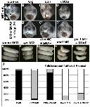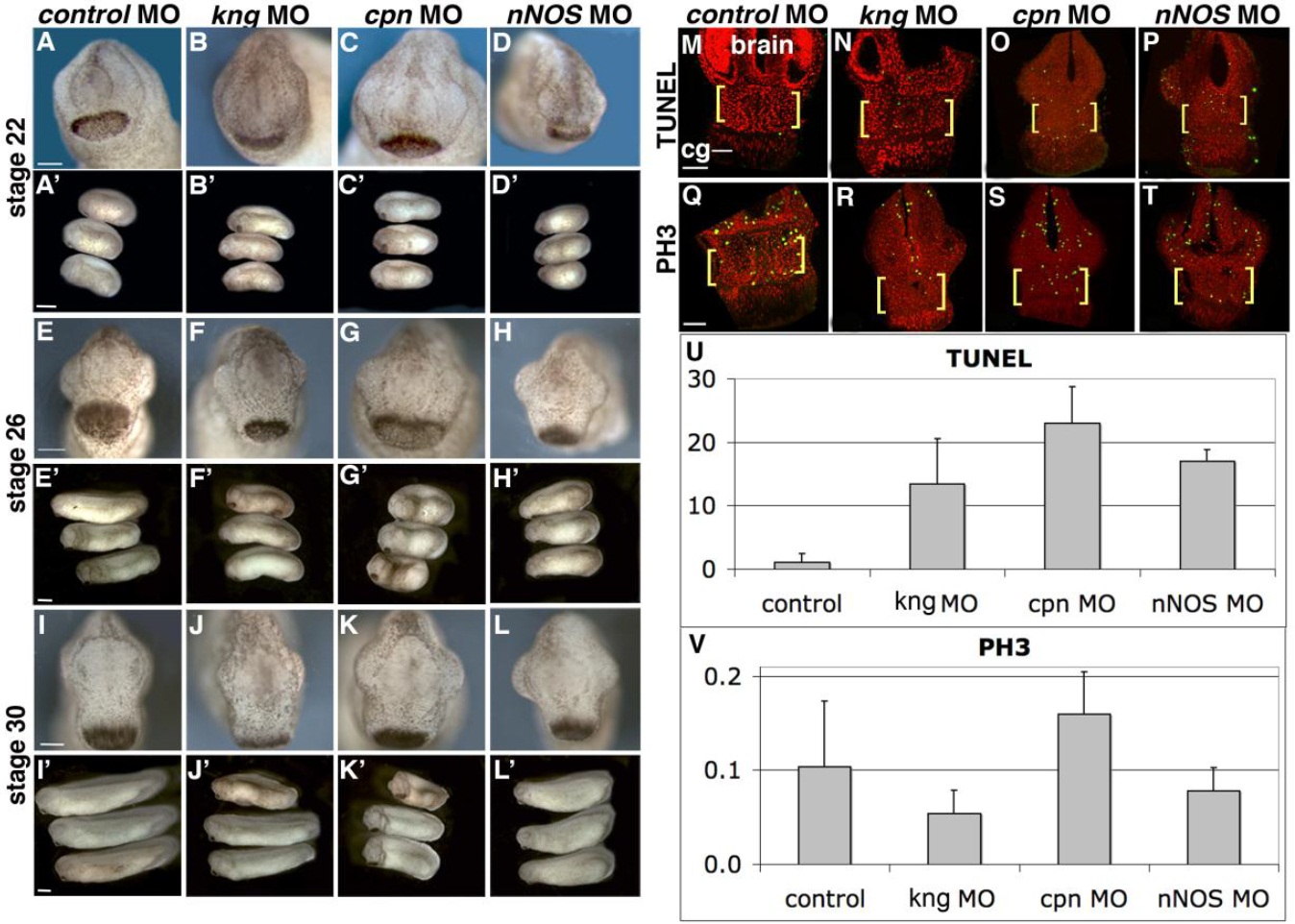 Figure S3. Phenotypic comparison at early stages and TUNEL, PH3 staining, related to Figure 2. (A-L) Frontal views of control and LOF embryos at earlier stages 22, 26 and 30, complement to Fig.2. Scale bar: 200 m. (A’ - L’) Lateral views of control and LOF embryos at earlier stages 22, 26 and 30. Scale bar: 500 m. Whole body phenotypes vary from morphant to morphant. kng morphants displayed a normal head size (B, F, J). Pockets of edema frequently formed in the presumptive heart region starting at stage 26. cpn morphants displayed a larger head relative to the posterior, most obvious at stage 22 (C, G, K). These morphants showed a tendency to disintegrate at high MO levels after stage 30 (hatching), suggesting abnormal epithelial integrity. nNOS morphants showed a diminished overall head size and expanded posterior (D, H, L). All morphants had reduced pigment and diminished movement at low MO levels, and no ability to move at high levels. Cell death was increased in LOF embryos. (M-P) Histological coronal sections showing TUNEL labeling in the presumptive mouth (brackets) at stage 26. Scale bar: 100m. (Q-T) Histological coronal sections with PH3 labeling in the presumptive mouth (brackets) at stage 26. Scale bar: 100m. (U) Graph showing TUNEL data. kng (average n=13.3 positive cells), cpn (average n=23.0 positive cells), and nNOS (average n=17.0 positive cells) morphants have an increase in cell death, respectively, compared with control morphants (average n = 1 positive cell), n = 8 embryos counted per condition, p values < 0.05. (V) Graph showing PH3 positive cells (green) compared to negative cells (red). kng (5% of total cells), cpn (16% of total cells), and nNOS (8% of total cells) morphants have a similar level of cell proliferation, respectively, compared with control morphants (10% of total cells), n = 8 embryos per condition, p values > 0.2. |