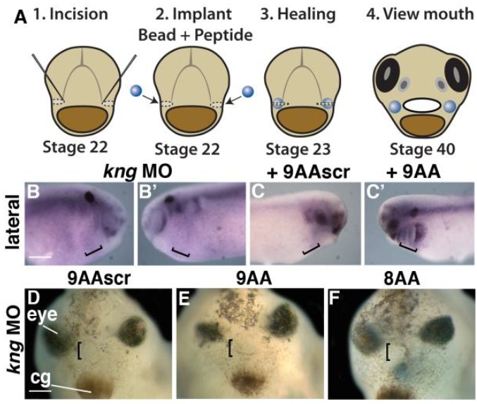Figure S4. Laterally located Bradykinin-like peptides promote cranial NC migration but do not restore mouth opening in kininogen (kng) morphants, related to Figure 3. (A) Schematic. (B,B’) kng morphant with no beads (35% with right side expression, n=17). (C,C’) kng morphant plus implanted beads (74% with right side expression, n=19). kng morphants had 9AA peptide implanted on the right side of the head, and 9AAscr peptide implanted on the left side of the head. Bracket: normal location of branchial arch 2. Scale bar: 120 m. (D) kng morphant with 9AAscr peptide (28% with a normal mouth, n=14). (E) kng morphant with 9AA peptide (21% with a normal mouth, n=14). (F) kng morphant with 8AA peptide (28% with a normal mouth, n=14). Bracket: unopened mouth. Scale bar: 100 m. |
