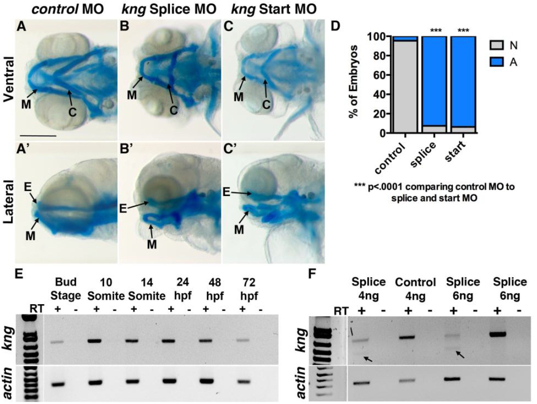 Figure S6. kininogen (kng) is expressed throughout zebrafish craniofacial development and loss of function results in craniofacial cartilage abnormalities, related to Figure 7. (A-C, A’-C’) kng loss of function using splice site and start site morpholinos. Embryonic cartilage was observed at 5dpf using alcian blue staining in three independent experiments. E, Ethmoid plate. C, Ceratohyal cartilage. M, Meckel’s cartilage. Scale bar: 250m. (A,A’) Control morpholino injected embryos appeared normal (95% normal, n=43). (B-B’, C-C’) Splice and start morphants showed abnormal facial cartilage. Meckel’s cartilage is truncated and lies at an abnormal angle. The ceratohyal cartilage points at an abnormal angle, perpendicular to the midline. (kng splice morpholino (B,B’) 7% normal, n=95; kng start morpholino (C,C’) 6% normal, n=47). (D) Quantification of morphant phenotypes. P-values: one-tailed Fisher Exact test. (E) Non-quantitative RT-PCR. kng expression is present at bud stage and extends until 72hpf. Expression spans mouth opening at 48hpf and formation of facial cartilage at 72hpf. (F) Non-quantitative RT-PCR. RNA was extracted at 24hpf. Controls yield normal length kng transcripts, while splice morphants yield fewer normal length transcripts and a truncated transcript. Arrow: truncated transcript band. |