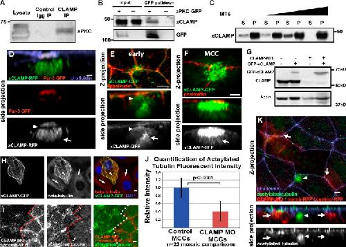 Figure 3. CLAMP interacts with aPKC and stabilizes MTs. (A) Western blot of a coimmunoprecipitation using anti-CLAMP mAb probed with anti-aPKC antibody. (B) Western blot probed with anti-CLAMP mAb of a GFP pull-down using NHS-GFP beads with wild-type lysates (â) or lysates from embryos expressing aPKC-GFP (+). (C) Western blot using anti-CLAMP mAbs of an MT pelleting assay with recombinant GST-tagged CLAMP. S, supernatant fraction; P, pellet. MT concentrations are 0, 0.3, 1.2, and 2.4 µM. (D and E) Localization of CLAMP to the leading edge (arrowheads) colocalized with Par3-GFP (D) and to the centriole cluster (arrows). (F) Image highlighting CLAMP localization to the apical surface and to the associated MTs (arrow). (G) Western blot using anti-CLAMP mAb on lysates from control embryos (lane 1) and embryos injected with GFP CLAMP (lanes 2 and 4) and CLAMP MO (lanes 3 and 4). (H) Staining with antiâβ-tubulin and DAPI of RPE-1 cells expressing xCLAMP-GFP (arrowheads) compared with neighboring non-CLAMP-expressing cells (arrows) after cold-induced MT depolymerization. (I) Acetylated MT staining in mosaic embryos with CLAMP morphant OCs marked with membrane-RFP. (J and K) Quantification (J) and representative image (K) of acetylated MT staining during intercalation in mosaic embryo CLAMP morphant MCCs (arrows), and wild-type MCCs (arrowheads). Membrane-RFP and centrin-RFP were injected to identify CLAMP MOâcontaining MCCs. The distinct staining pattern of acetylated tubulin in MCCs allows for the differentiation control MCCs from other intercalating cell types. Quantification in J is statistically significant (P < 0.0001, t test). Error bars represent standard deviations. See Fig. S2. Bars, 5 µm.