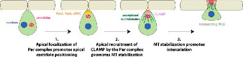 Figure 5. Model for the steps involved in regulating MT stability during radial intercalation. We propose that the Par complex mediates both apical positioning of centrioles (1) and asymmetric accumulation of CLAMP (2). CLAMP asymmetry leads to asymmetric stabilization of MTs (2) along the axis of migration that promotes intercalation (3).