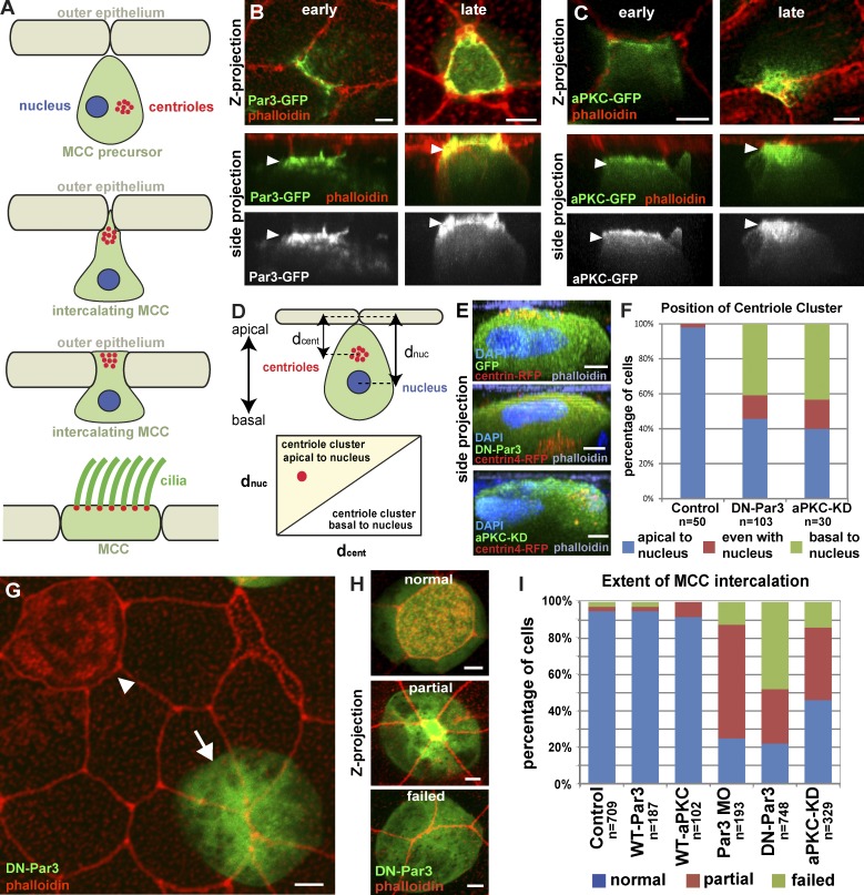 Figure 1. Apical positioning of centrioles and intercalation requires the Par complex. (A) Schematic representation of MCC intercalation. (B and C) Apical localization (arrowheads) of Par3-GFP (B) and aPKC-GFP (C) at different stages of intercalation (early and late). (D) Schematic of the quantification of centriole positioning in MCCs. (E and F) Representative z stack cross-section images (E) and quantification (F) of centriole position in control, DN-Par3, and aPKC-KD MCCs. (G) Mosaic image showing wild-type MCC that has intercalated (arrowhead) and a DN-PAR3-GFP (arrow) MCC that failed to intercalate. (H) Images illustrating the three different phenotypes used for scoring MCC intercalation. (I) Quantification of intercalation in MCCs expressing GFP, Par3-GFP, aPKC-GFP, Par-3 MO, DN-Par3-GFP, or aPKC-KD-GFP. For all experiments, cells from a total of at least five embryos from at least two independent experiments were quantified unless specified otherwise. Quantification in F is based on at least 10 cells each from a total of at least five embryos from at least two independent experiments. Quantifications of DN-Par3 and aPKC-KD phenotypes in F and I are statically significantly different from controls (P < 0.0001, see Table S1). Side projection refers to side views of projection along the x axis in all figures. See Fig. S1. Bars, 5 µm.