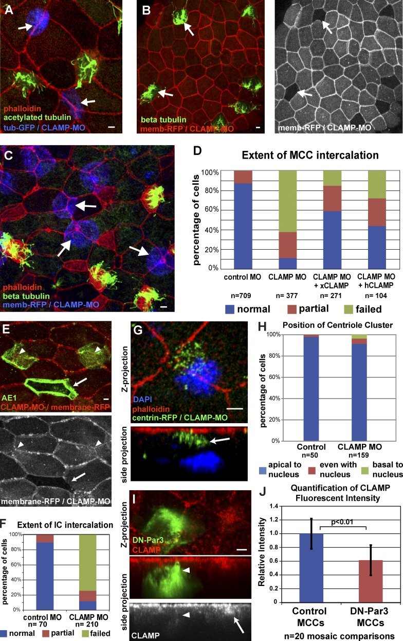 Figure 4. CLAMP is required cell autonomously for intercalation. (A) Mosaic embryos coinjected with CLAMP-MO and αtub-GFP (arrows) stained with anti-acetylated tubulin and phalloidin. (B) Mosaic embryos coinjected with CLAMP-MO and membrane-RFP stained with antiâβ-tubulin and phalloidin (wild-type MCCs still intercalate, arrows). (C) Mosaic embryo coinjected with CLAMP-MO and membrane-RFP (blue), showing MCC intercalation defects (arrows). (D) Quantification of intercalation in MCCs injected with control MO, CLAMP MO, or CLAMP MO rescued with xCLAMP or hCLAMP. (E and F) Representative image (E) and quantification (F) of intercalation defect in ICs (green, AE1 staining) containing CLAMP MO (arrowheads) versus wild-type (arrow, lack of red). (G and H) Image (G) and quantification (H) of centriole position in CLAMP morphant MCCs (the arrow highlights the centriole cluster). (I and J) Representative image (I) and quantification (J) of mosaic embryos showing the loss of CLAMP staining in DN-Par3âexpressing MCCs (arrowheads) compared with wild-type (arrow). Quantification in H is based on at least 10 cells, each from a total of at least five embryos from at least two independent experiments. Quantifications of intercalation defects in CLAMP morphants in D and F are significantly different from controls, as are morphant embryos from rescue (P < 0.0001, see Table S1). A Ï2 test shows no statistical significant difference in H (P = 0.236, see Table S1). Quantification of reduction in apical CLAMP levels in DN-Parâexpressing cells is significantly different from controls (P < 0.01, see Table S1). See Fig. S3. Error bars represent standard deviations. Bars, 5 µm.